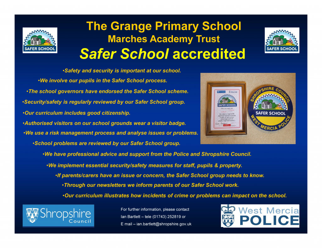 Ian Bartlett, Crime Prevention Officer, Shropshire Council commented; “Congratulations to The Grange Primary School on maintaining their Safer School accreditation. The School was accredited a Safer School in 2013 and eight years later, Mrs Summers and governors have continued the process. The recent Safer School meeting, held through Teams video, clearly indicated the school’s commitment to the initiative and it was really positive. At the meeting, we updated the action plan, checked the security/safety measures, reviewed the parent/carer/pupil surveys, analysed the incident reporting and planned for the future. Although not security related, the majority of the feedback from the surveys concerned the Covid precautions so we considered these measures. A vital part of Safer Schools is communication and involving governors, staff, pupils, parents/carers, Police and Council. At The Grange Primary School, good communication is achieved through meetings, surveys and newsletters. A new Safer School certificate was presented to the school and a further annual meeting is planned for Summer 2022. Overall, excellent work!”